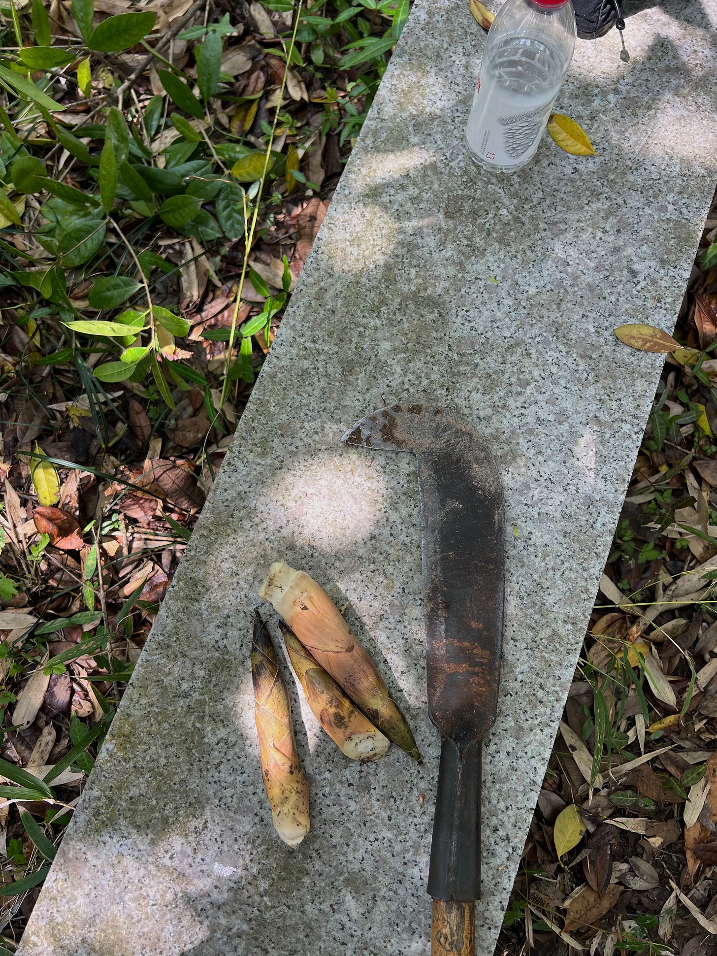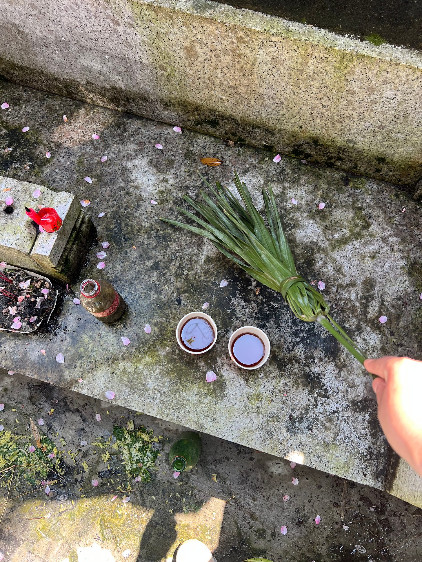 When we arrived, my ye ye’s house was locked. The persimmon tree that’s probably older than most of us there was still standing in front of the house. It was just starting to leaf out, it seemed like. From there we started the hike to the graves. There was a fish pond half away there. Some farmers were picking put the pre-Qingming tea leaves, which are known for the more tender buds and subtle aromas. At the graves, we all went to work. My cousin, an arborist, pulled weeds and cleared overgrowth. He handed me his electric gardening shears, which I became addicted to almost immediately. My mother set out the food and wine we had prepared in advance, for my grandparents to enjoy in heaven. The other adults swept with willow branches. The children dug for spring bamboo shoots in the grove.